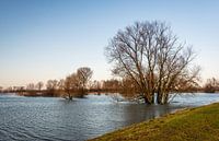 Overstroomde Buitenpolder Het Munnikenland in de Bommelerwaard bij het Nederlandse dorp Poederoijen, gemeente Zaltbommel, provincie Gelderland. Op de achtergrond in het midden van de foto is Slot Loevestein nog juist zichtbaar. De bomen staan in het water en de silhouetten contrasteren met de blauwe hemel. De foto is gemaakt in januari 2018.
