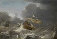 Een driemast koopvaardijschip, mogelijk een fluyt, wordt in het midden getoond, werkend voor een storm in open zee. Het ligt in konvooi met twee andere schepen. Twee van de zeilen van het hoofdschip zijn gespreid en het grootzeil is tijdelijk uit de hand gelopen na het losbreken van de wind. De topzeilen en laat bezaan worden opgerold. Het voorzeil wordt getekend met de werf half neergelaten. Aan de tuigage op het dek zijn figuren te zien, met de voorkant naar beneden gericht, die de tuigage op het dek verzorgen. Links volgt een vierkantgetuigde, enkelmast boot achterstevoren van het leidende schip. In dit schip zit een klein figuurtje, gekleed in lammetjesrood. Het beeld is een volmaakte weergave van tekenkunst. Helemaal links vaart een ander groot schip, onder opbollende hoofd- en voorgangen, naar het midden van het schilderij en naar de chaos die de storm teweegbrengt. In de golven op de rechtervoorgrond zweeft een vat. Het achterschip van een ander schip is uiterst rechts van de compositie zwak zichtbaar. De rest van dit schip is afgesneden door de rand van het schilderij. Net als in andere werken van Porcellis (zie BHC0719 en BHC0720) ligt de nadruk minder op de schepen zelf dan op de atmosferische effecten van lucht, wolken, lucht en water. De lucht neemt de helft van de scène in beslag. Rechts donkere wolken versterken het atmosferisch effect. Alle aspecten van het schilderij zijn in vrijwel identieke tinten donkergrijs weergegeven. Terwijl de zee en de lucht elkaar on