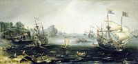 Dit schilderij is het mooiste voorbeeld van het vroege werk van Van Eertvelt in de collectie van het Nationaal Maritiem Museum en vertegenwoordigt de verscheidenheid die inherent is aan het onderwerp van de kunstenaar. De bedrijvige scène van Nederlandse en Vlaamse schepen die met hout geladen worden, speelt zich af in een natuurlijke haven langs een Scandinavische fjord. Op de linkervoorgrond zijn grote aantallen boomstammen naar beneden gebracht in de baai, waar ze door talrijke arbeiders in het water zijn gebundeld. De schepen aan de wal worden door de hekse havens geladen. De spiegel van het grote schip links is versierd met een afbeelding van de Maagd Maria, met aan weerszijden aanbidders. Hiermee wordt waarschijnlijk de oorsprong van het schip als de katholieke Zuidelijke Nederlanden geïdentificeerd, hoewel de vaandrie horizontale strepen van zwart, goud en wit nog moeten worden geïdentificeerd. Zo ook het schildembleem van een zwarte stier of os, met de staart over de rug, op een blauwe grond, die op de bovenste tafferel verschijnt: een soortgelijk omtrekembleem van een stier verschijnt op de witte vlag op de hoofdmast. Beide kunnen een stad van herkomst vertegenwoordigen, of alleen de naam van het schip. Rechts komt een Amsterdamse koopvaarder, die in de verte gevolgd wordt door andere schepen, op het toneel. Tussen de grotere schepen dartelen kleine bootjes rond. Voorbij de drukte komt de kustlijn van ronde rotsen, pijnbomen en dennenbomen omhoog en leidt het oog naa