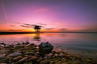 In het mooie zeeland een avond met mooie zonsondergang kleuren over een meer met een uitkijktoren over het water.