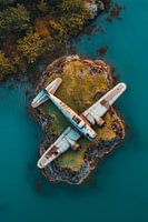 Een verlaten vliegtuig staat majestueus op een klein, groen eiland omringd door glinsterend water. De zachte, vluchtige kleuren van de natuur staan in indrukwekkend contrast met het roestige metaal. Deze fascinerende scène straalt een gevoel van avontuur uit en is perfect voor elke woonkamer die een verhaal wil vertellen en de verbeelding wil prikkelen.