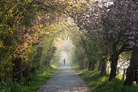 Fotograaf op een mistige ochtend in de dreef gevuld met kersenbloesems.