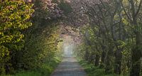 Mistige ochtend in de dreef gevuld met kersenbloesems.