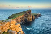 Het meest westelijke punt van het eiland Skye is Neist Point, een klein schiereiland met een vuurtoren aan het einde. Vanaf de omringende kliffen heb je een prachtig uitzicht, zoals in dit shot bij zonsondergang toen de laatste stralen van de dag de rotsen in een prachtig rood licht baden.