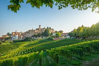 Wijngaarden en het dorp Neive met bladeren als omlijsting, in de Langhe. Unesco werelderfgoed, regio Piemonte, Italië, Europa.