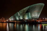 Het iconische wetenschapsmuseum Nemo gefotografeerd in de avond. Op het vlakke water weerspiegelen de lichten wat de foto een dromerig beeld geeft. De lijnen van het gebouw worden mooi uitgelicht door de schijnwerpers wat een kleurschakering in het groen van de gevel geeft. Door het hoge diafragma worden de straatlantaarns sterren.