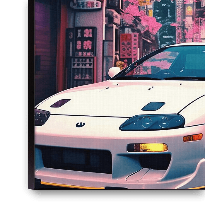 Een maagdelijk witte Toyota Supra MK IV staat in een levendige cyberpunkstraat, omringd door Japanse neonreclame en hangende roze kersenbloesemblaadjes.