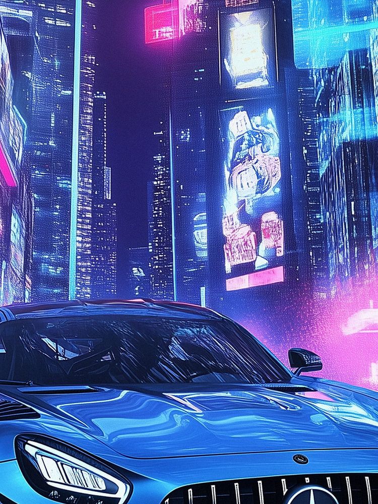 Dit visueel opvallende beeld toont een gestroomlijnde, levendige blauwe Mercedes-AMG GT, prominent weergegeven in wat lijkt op een futuristisch, met neon doordrenkt stadslandschap bij nacht. De auto staat onder een lage hoek en kijkt recht naar voren, waarbij de agressieve grille, de scherpe koplampen met ingewikkelde LED-patronen en de brede houding goed tot hun recht komen. De donkere lak van de auto contrasteert prachtig met de intense, gloeiende magenta, cyaan en elektrisch blauwe lichten van de torenhoge gebouwen op de achtergrond. Deze lichten creëren sterke reflecties op de natte, donkere grond en voegen diepte en een gevoel van beweging toe aan de scène. De algehele esthetiek doet denken aan een cyberpunk of sci-fi stedelijke omgeving, waarin hoogwaardig auto-ontwerp wordt gecombineerd met een levendige, elektriserende nachtelijke sfeer.