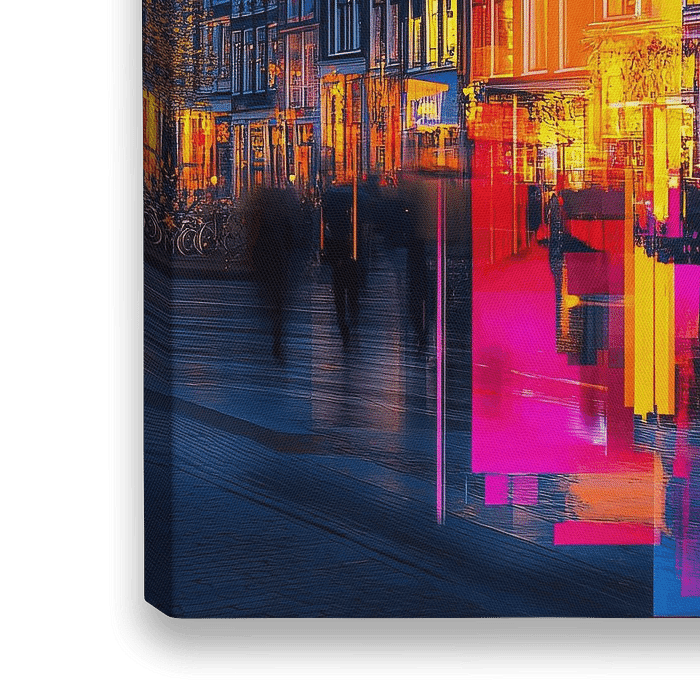 Dit kunstwerk biedt een unieke, futuristische interpretatie van de iconische Amsterdamse grachtenhuizen. De traditionele gevels zijn in felle neon kleuren gehuld, variërend van levendig roze tot diep oranje en intens blauw, wat een surrealistisch en dynamisch effect creëert. De strakke lijnen en heldere vlakken van de kleuren overlappen…