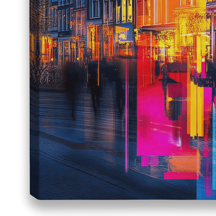 Dit kunstwerk biedt een unieke, futuristische interpretatie van de iconische Amsterdamse grachtenhuizen. De traditionele gevels zijn in felle neon kleuren gehuld, variërend van levendig roze tot diep oranje en intens blauw, wat een surrealistisch en dynamisch effect creëert. De strakke lijnen en heldere vlakken van de kleuren overlappen…