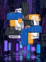 Dit fascinerende kunstwerk dompelt de kijker onder in een nachtelijke stedelijke scène, badend in de zachte gloed van neonlichten en de ritmische dans van de regen. Verticale strepen witte regen dalen neer en weerkaatsen op de gladde, donkere straat beneden, waar levendige paars, blauw en elektrisch groen rimpelen. Tegen dit stemmige…