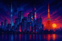 De nacht valt niet over Tokyo. Ze ontvouwt zich. Ze bloeit op en gloeit vanuit elke toren en steeg. Hier draagt de lucht zowel sterren als schakelingen en wordt de stad meer dan een plek. Dit is geen herinnering of plattegrond maar een moment vol neonkleuren. Gebouwen rijzen op als lichtzuilen terwijl de Tokyo Skytree en de Tokyo Tower samen de skyline verankeren als bakens van de toekomst. Dit schilderij vangt die elektrische stilte, de rust onder de gloed.