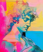 Moderne herinterpretatie van klassieke beeldhouwkunst, geïnfuseerd met levendige, neonkleurige tinten die een krachtig contrast vormen met de traditionele, monochrome uitstraling van marmer. De klassieke kenmerken van het beeld zijn verfijnd en gedetailleerd, terwijl de abstracte, kleurrijke achtergrond een eigentijdse draai geeft en het historische met het hedendaagse vermengt. Dit stuk kan gezien worden als een dialoog tussen het verleden en het heden, waarbij het de tijdloze schoonheid van klassieke kunst viert en tegelijkertijd een moderne, levendige energie uitstraalt.