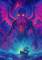 In deze elektriserende neon aquarel interpretatie van Cthulhu die oprijst uit de oceaan, wordt de legendarische kosmische entiteit opnieuw verbeeld met gloeiende intensiteit en surrealistische schittering. Levendige strepen van elektrisch blauw, heet roze en neongroen kabbelen over de monsterlijke vorm terwijl hij uit de beukende golven oprijst. Zijn tentakels wervelen met hypnotiserende energie en reiken omhoog als chaotische bliksemschichten, terwijl zijn enorme vleugels pulseren met een stralende, buitenaardse gloed. De donkere zee eronder wordt in neon weerspiegeld en verandert het water in een lichtgevende storm van kleur.