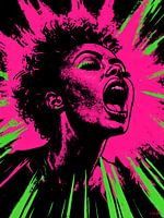 Deze explosieve digitale kunstcreatie barst van energie en kracht. Het schreeuwende gezicht van de vrouw, gehuld in felroze en neongroen, lijkt midden in een visuele uitbarsting gevangen. De ruwe, spetterende lijnen die uit haar lichaam en haar lijken te schieten, versterken het gevoel van beweging en intense emotie. Het contrast tussen…