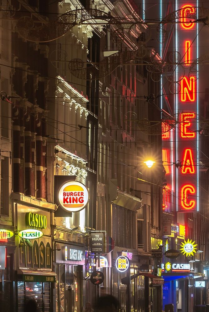 Deze sfeervolle foto toont het iconische Cineac-gebouw in de Reguliersbreestraat, gezien vanaf het Muntplein in Amsterdam. Het historische pand springt direct in het oog dankzij de grote, rode neonletters. De regenachtige avond versterkt de sfeer; de glinsterende reflecties van lichten op de natte straat en tramrails voegen een filmisch en nostalgisch karakter toe aan het geheel. De straat is levendig, met een mix van klassieke architectuur, moderne winkels en verlichte uithangborden, wat een tijdloze indruk geeft van het Amsterdamse stadsleven.