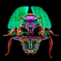 Dit gedurfde kunstwerk toont een close-up van een insect, vastgelegd in neonachtige kleuren die de natuurlijke schoonheid van het wezen op een futuristische manier benadrukken. De combinatie van paars, groen en oranje creëert een bijna magische uitstraling, terwijl de gedetailleerde weergave van de haren, vleugels en ogen het insect…