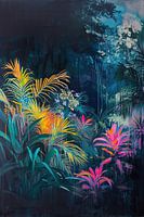 Details: abstract, neon, schilderij, jungle, flora, zwart, blauw, roze, geel, groen