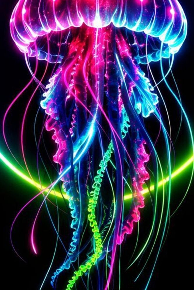 Een betoverende neonkwal zweeft sierlijk tegen een diepzwarte achtergrond, gloeiend met levendige tinten roze, blauw, groen en violet. De lichtgevende halo die de kwal omringt, creëert een moderne en bijna kosmische sfeer, waarin zeeleven wordt vermengd met futuristische digitale kunst. Vloeiende tentakels voegen beweging en elegantie…
