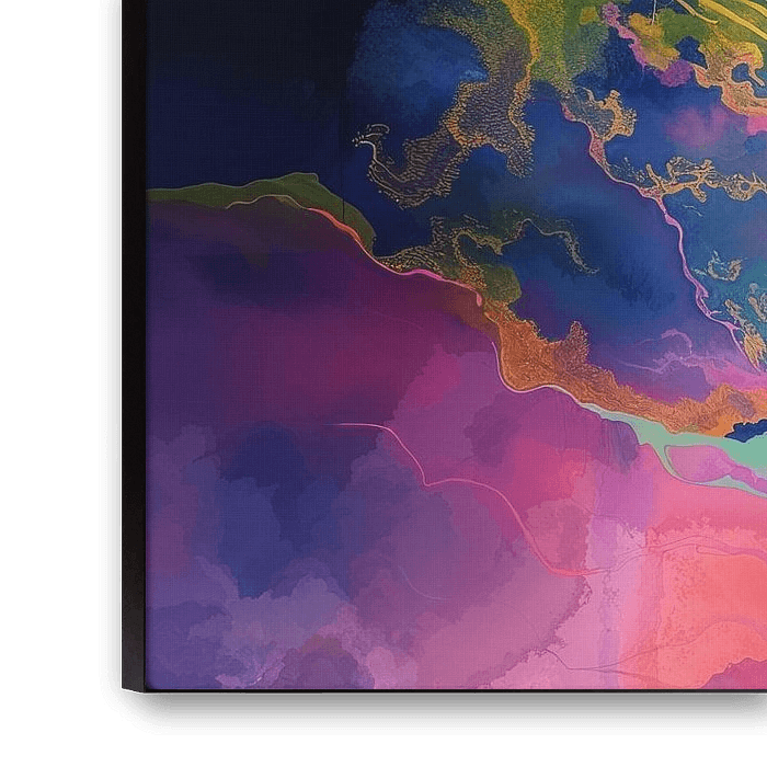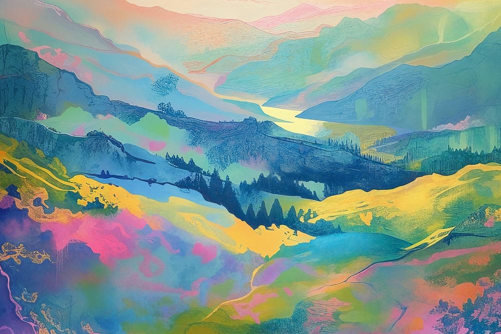 Neon Landschapsschilderij - Dit neon landschapsschilderij toont een adembenemend berglandschap, badend in een scala van onwerkelijke, levendige kleuren. De voorgrond bevat weelderige, diepzwarte silhouetten van bomen en struiken, die scherp afsteken tegen de levendige achtergrond. Verder kijkend zie je rollende heuvels en valleien met een ongekend palet van kleuren, variërend van neonroze, elektrisch blauw, levendig groen tot geeloranje tinten die naadloos in elkaar overvloeien. Deze kleuren zijn op dynamische wijze aangebracht waardoor ze haast vloeibaar lijken, alsof het landschap een levend organisme is. Het midden van het schilderij bevat het glinsterend oppervlak van een meer, dat als een spiegel werkt en de waanzinnige kleuren van de lucht en het terrein reflecteert. De lucht zelf is een labyrint van zachte, fluweelachtige wolken in tinten van zachtroze, warm oranje en subtiel geel, wat het geheel een bijna droomachtige uitstraling geeft. Het gebruik van neonkleuren tegen een donkere voorgrond versterkt het etherische, bijna surreële gevoel van het landschap.