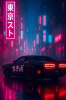 Dit kunstwerk met cyberpunk-thema toont een krachtige Amerikaanse muscle car te midden van de met neon doordrenkte straten van Tokio. De levendige reflecties en stemmige sfeer geven een samensmelting van snelheid, kracht en stedelijk futurisme weer.