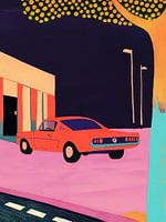 Dit kunstwerk brengt een betoverende mix van retro-nostalgie en moderne esthetiek. Een klassieke Ford Mustang, in een warme oranjerode tint, staat geparkeerd in een surrealistisch en sfeervol nachtlandschap. De diepe paarse lucht contrasteert prachtig met de roze en oranje tonen van de omgeving, terwijl de felgekleurde boom en geometrische elementen een speelse, bijna dromerige sfeer creëren. De kunstzinnige compositie en levendige kleuren maken dit een perfecte keuze voor liefhebbers van vintage auto’s, pop-art en gedurfde, moderne interieurdecoratie.