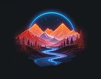 Een abstract digitaal kunstwerk met een levendig berglandschap bij nacht, verlicht door een gloeiende blauwe maan of poollicht, een kronkelende neonblauwe rivier en roodoranje bergen met scherpe, hoekige toppen. Pijnbomen langs de oevers van de rivier voegen diepte toe aan de gestileerde scène.