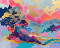 Details: abstract, landschap, neon, boom, bergen, wolk, natuur, goud, blauw, roze
