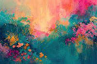 Details: abstract, neon, landschap, bos, roze, geel, oranje, blauw, kunst, schilderij