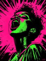 Deze explosieve digitale kunstcreatie straalt een rauwe, pure energie uit in een mix van popart en street-art invloeden. De schreeuwende vrouw, gevangen in een hoogcontrastcombinatie van felroze en neongroen, lijkt één te worden met de achtergrond die uitbarst als een visuele explosie. De felle neonpigmenten en ruwe lijnen versterken de…