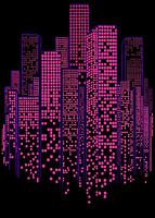 Een moderne, artistieke weergave van een skyline van een stad bij nacht, met hoge gebouwen die oplichten in levendige roze en paarse tinten en een futuristische en digitale sfeer oproepen.