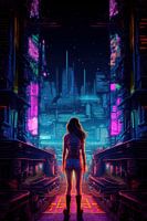 Het portret van de jonge vrouw was fascinerend. Met haar rug naar de camera toe en haar gezicht gericht op de levendige stad, leek het alsof ze een moment van rust nam te midden van de drukte. De stad zelf was een chaos van neonlichten en felle kleuren die haar eromheen flitsten.