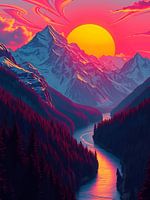 Een levendig neonabstract landschap met bergen onder een opvallende zonsondergang met een kleurrijke, gestileerde lucht.