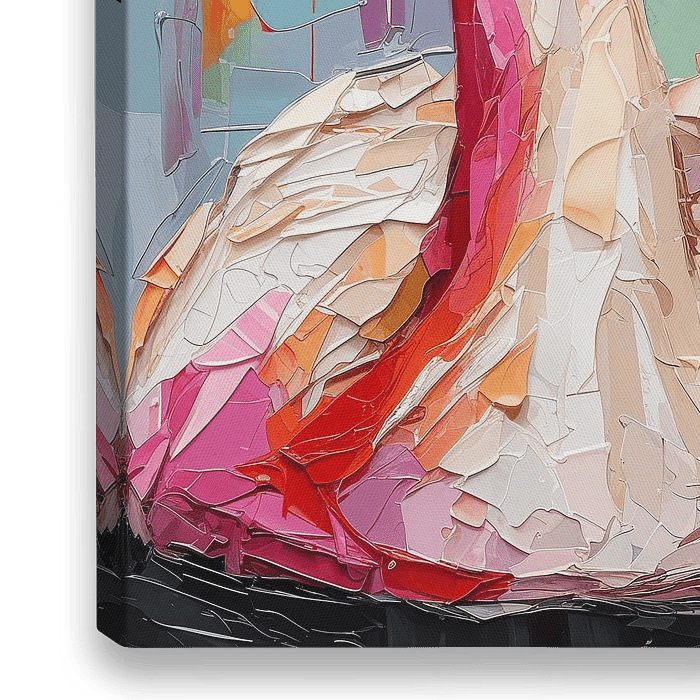 Neon Zwaan - Dit schilderij toont een zwaan in een levendig kleurenpalet, met een nadrukkelijke textuur die door de dikke verfopbreng lijkt te zijn bereikt. De achtergrond bestaat uit blokken van rustige, koelere tinten die een contrast vormen met de warme kleuren van de zwaan zelf. Het werk speelt met het abstracte tegenover het…