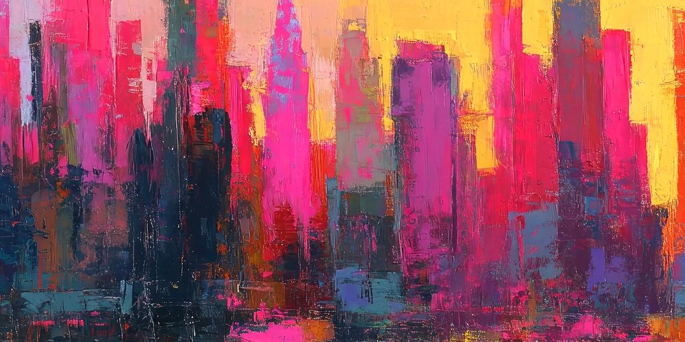 Alsof je net hebt weggekeken van de zonsondergang boven de Hudson en je ogen nog nagloeien. Dit schilderij vangt de skyline van Manhattan (New York Verenigde Staten) in een licht explosieve kleurencompositie van neonroze, magenta, felgeel en diepe blauw- en paarstonen. De stad wordt weerspiegeld in het water en lijkt in beweging te blijven, zelfs op doek.