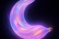 Een neon banaan zweeft op een diepe, donkere achtergrond, omgeven door vloeiende lichtstrepen en zachte gloed. Iriserende tinten lopen in elkaar over en vormen glanzende randen die de kromming accentueren. Het sterke contrast tussen helder licht en schaduw geeft een gevoel van beweging en diepte. De organische vorm voelt modern en…