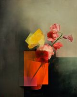 Neon bloemen, contemporary art. Een bijzonder werk van een vaas met bloemen, gecombineerd met neon blokken. Kies zelf de afmeting en het materiaal voor deze blikvanger.