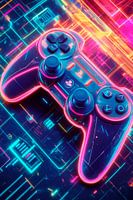 Midden in een futuristische wereld van felle neonkleuren ligt een stijlvolle gamecontroller die de zintuigen prikkelt met zijn gebogen vormen en levendige lichten. De harmonieuze combinatie van diepblauw en felroze laat de elektronica pulseren, terwijl pixelachtige patronen op de achtergrond een digitale dimensie openen die je uitnodigt…
