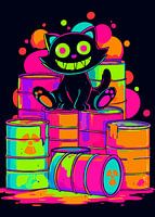 Dit schreeuwerige, kleurrijke kunstwerk toont een cartooneske kat met te grote ogen die op een stapel kleurrijke verftrommels zit. De felle tinten - van neongroen tot roze - en het spetterende kleureffect op de achtergrond creëren een explosieve energie. De stijl is sterk geïnspireerd op pop-art en doet denken aan moderne street art-esthetiek met een vleugje humor.