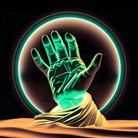 Het kunstwerk toont een mannenhand in groen neonlicht die zweeft boven een gloeiende cirkelvormige achtergrond. De compositie combineert elementen van Egyptische kunst, surrealistische beeldhouwwerken en hyperrealistische technieken, waardoor een fascinerende en mystieke esthetiek ontstaat die doet denken aan een tarotkaart.