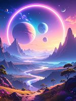 Een dramatisch, contrastrijk fantasielandschap met een heldere neonrivier die door donkere bergen stroomt en een kosmische nachthemel. Combineert natuur en futuristisch licht.
