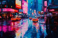 Te midden van een pulserende neonwereld worden de felle kleuren weerspiegeld op natte straten, terwijl gele taxi's ontspannen door de stad glijden. Kleurrijke lichtspelingen en stedelijke energie geven de nacht een unieke dynamiek, waardoor het landschap zowel levendig als dromerig is. Een fascinerend schouwspel van stedelijke…