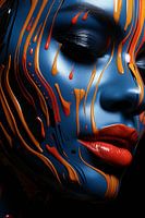Close-up portret van een vrouw in blauwe bodypaint met neon oranje verfdruppels.