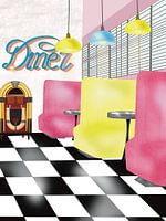 Deze sprankelende art print is een directe en vrolijke interpretatie van de klassieke Amerikaanse Diner uit de jaren '50. Het is een muurdecoratie vol energie, kleur en nostalgie.