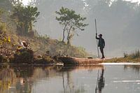 Deze foto is gemaakt tijdens een rondreis in Nepal (2009) in het Nationale Park Chitwan. Gedurende een boottocht op weg naar het Elephant Breeding Center kwam deze boot ons tegemoet varen en lukte het om deze foto inclusief nevel (hoge luchtvochtigheid) vast te leggen.
