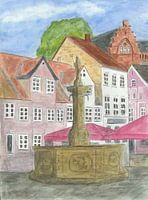 Deze aquarel toont de Neptunusfontein op de Nordermarkt in Flensburg.