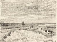 Vanaf Nes, een Waddeneiland in Friesland, Nederland, had je destijds dit uitzicht over de Waddenzee naar het vaste land. Een koe staat in de wei bij de duinen en enkele schepen zeilen voorbij op zee.