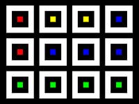 Centraal geplaatste vierkante stroken, matrix 04x03, aantal nesten N=2, willekeurig #04, middens rood, groen, blauw, geel