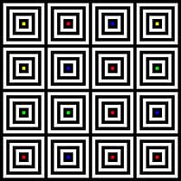 Centraal gerangschikte vierkante stroken, matrix 04x04, aantal nesten N=4, willekeurig #02, middens rood, groen, blauw, geel