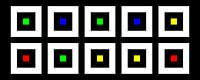 Centraal gerangschikte vierkante stroken, matrix 05x02, aantal nesten N=2, willekeurig #10, middens rood, groen, blauw, geel